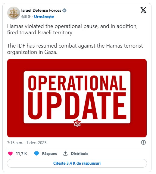 „Hamas a încălcat pauza operațională și, în plus, a tras în direcția teritoriului israelian. IDF a reluat lupta împotriva organizației teroriste Hamas în Gaza", a transmis armata israeliană.
