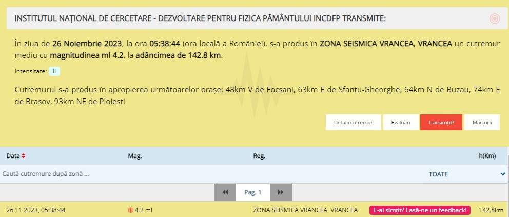 Un cutremur cu magnitudinea 4,2 s-a produs, azi, duminică dimineaţă, în zona Vrancea. Potrivit Institutului Naţional pentru Fizica Pământului (INFP), cutremurul a avut loc la o adâncime de 142 de kilometri.