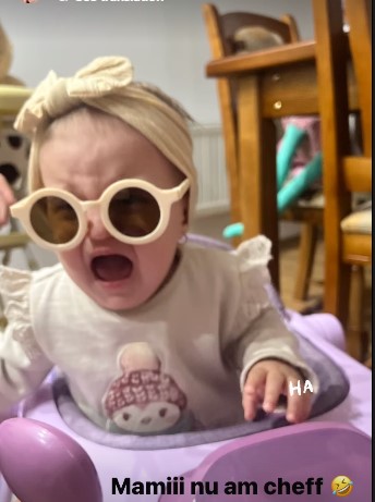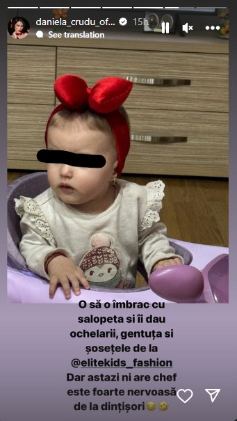 „O să o îmbrac cu salopeta și îi dau ochelarii, gentuța și șosetele, dar astăzi nu are chef. Este nervoasă de la dințișori”, a scris Daniela Crudu, la Story.