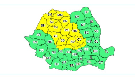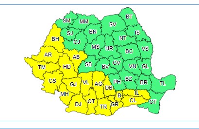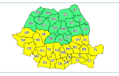 Primul cod galben va intra în vigoare în intervalul miercuri, ora 15:00 - joi, ora 06:00, în vest, centru și în zonele montane. Sunt anunțate perioade cu instabilitate atmosferică accentuată, care se va menifesta prin frecvente descărcări electrice, intensificări ale vântului (rafale în general de 55...70 km/h și izolat peste 80 km/h), vijelii, averse care vor avea și caracter torențial și grindină.