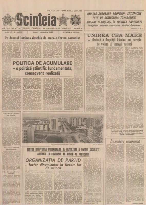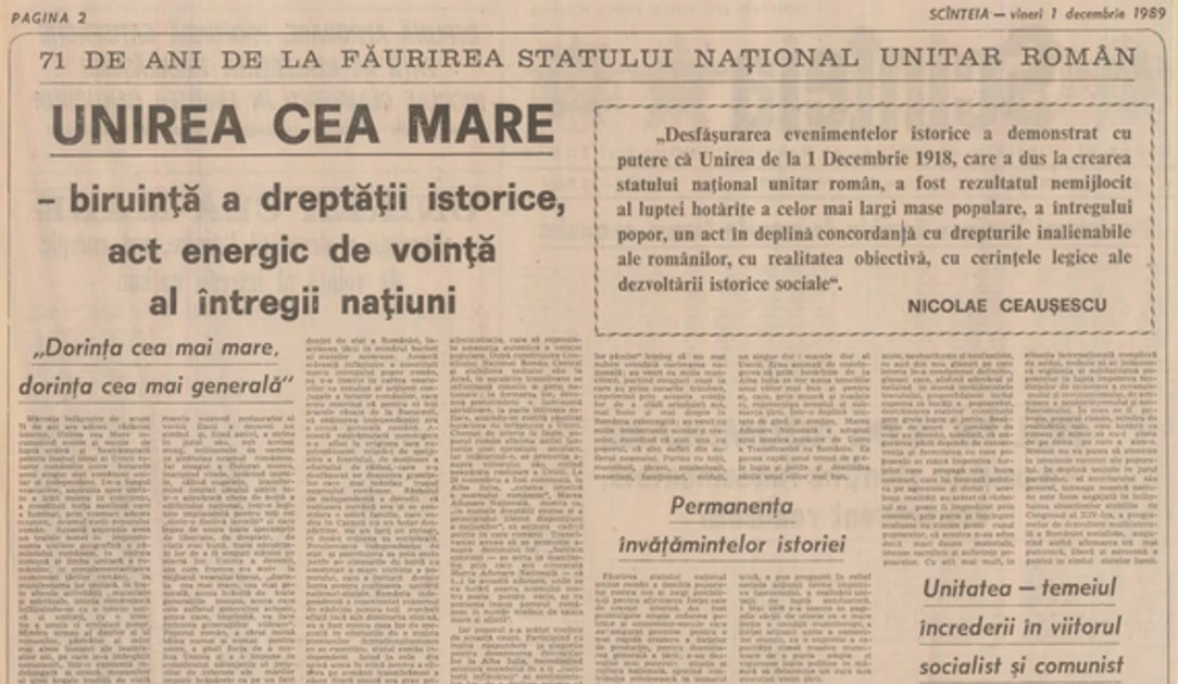 Ultimul 1 Decembrie sub dictatura lui Nicolae Ceaușescu a lăsat publicațiile fără multă cerneală. Cel mai mult a scris atunci Scânteia, portavocea Partidului Comunist Român. Iată un fragment din discursul dictorului, publicat sub titlul „Unirea cea Mare-biruință a dreptății istorice, act energic de voință a întregii națiuni”.