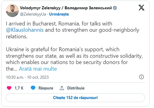 Este prima vizită a liderului de la Kiev în România. Președintele Klaus Iohannis a discutat ultima oară cu omologul său joi, la Summitul Comunității Politice Europene care a avut loc în Granada, Spania.