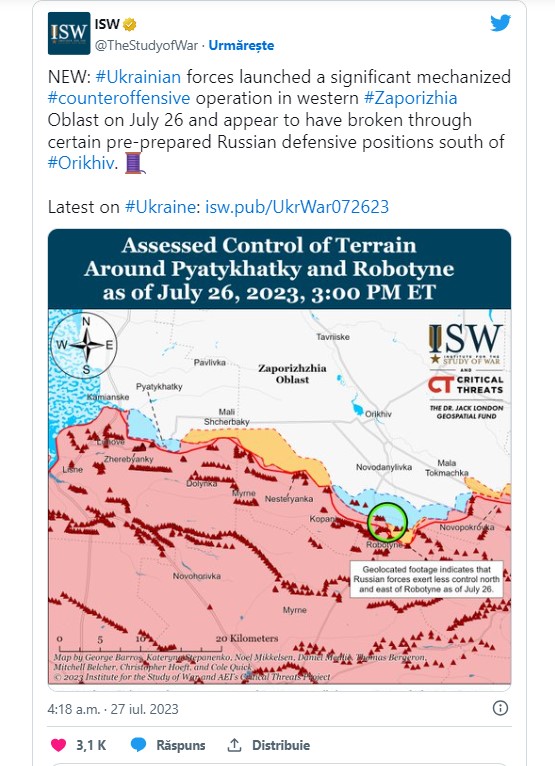 UPDATE: 14:05 Institutul pentru Studiul Războiului (ISW) evaluează că forțele ucrainene au reușit miercuri să spargă liniile fortificate ruse de la est de satul Robotîne, la circa 10 km sud de Orihiv, unde ar fi avansat cu 2,5 km. Rușii au folosit tactici standard de apărare și i-au împins înapoi, deși nu până la pozițiile lor inițiale.
