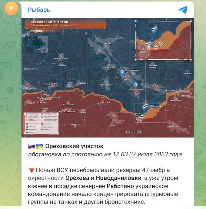 Ministerului rus al Apărării, a anunţat un atac „masiv” și bătălii aprige la sud de Orikhiv. Obiectivul ucrainenilor este de a tăia coridorul terestru dintre teritoriul ucrainean ocupat de ruși și peninsula Crimeea, fie de a avansa atât încât să pună peninsula în raza de acțiune a artileriei ucrainene.